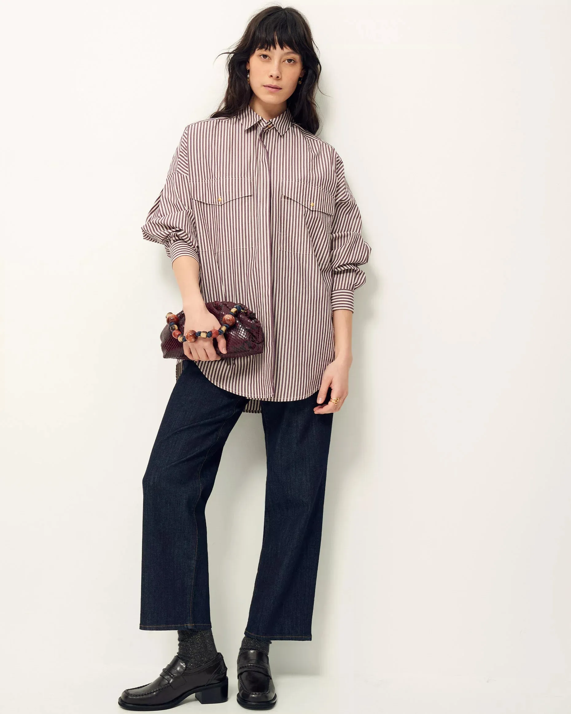 A loose-fitting long sleeve shirt with drop shoulders and patch pockets in a compact cotton poplin fabric with stripes. This style has a concealed button front closure with a jewel button at the collar and patch pockets with flaps.